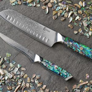 - Der Full “Tang Griff” macht das Messer ausgesprochen stabil und belastbar. Der leicht nach hinten verlagerte Schwerpunkt macht die Handhabung noch angenehmer und wertiger. Das makellos geschliffene Acryl um die Abalone Muschel gibt ein ganz besonderes Griffgefühl.